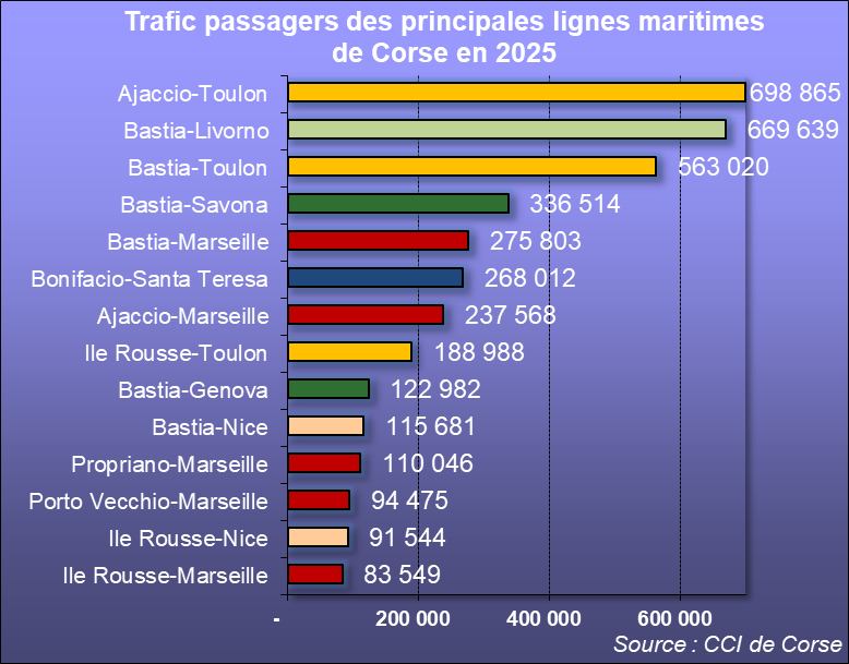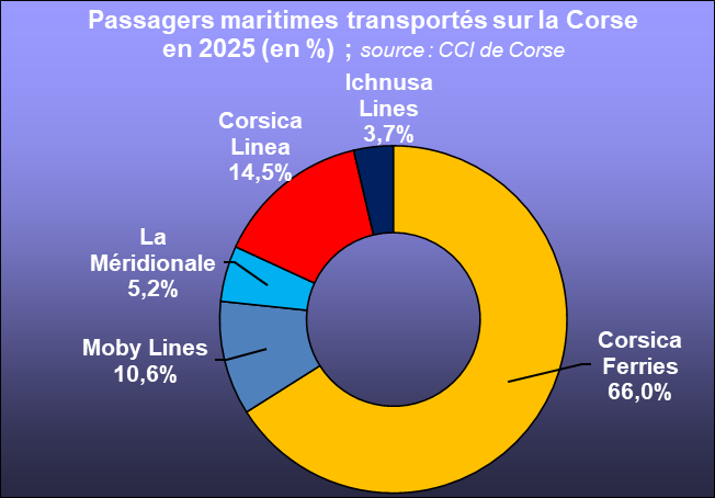 La concurrence entre opérateurs est donc plus ou moins forte selon les axes de transport maritime de la Corse. Au total, le marché maritime de la Corse se répartit de la manière suivante d'après la CCI de Corse. Toutes origines et destinations confondues, la Corsica Ferries est de loin le premier opérateur, avec 2,69 millions de passagers transportés à elle seule en 2025 sur la Corse, sur un total de 4,07 millions, soit un niveau global désormais légèrement supérieur à celui enregistré en 2019 avant la pandémie de la COVID-19. Elle est suivie par la Corsica Linea, dont le trafic passagers atteint désormais 590 000 passagers en 2025, devant la Moby (433 000), en fort recul en raison d'une programmation de rotations désormais fortement réduite sur la Corse. La Méridionale assure quant à elle le transport de 211 000 passagers en 2025, devant Ichnusa Lines (149 000), qui ferme la marche.